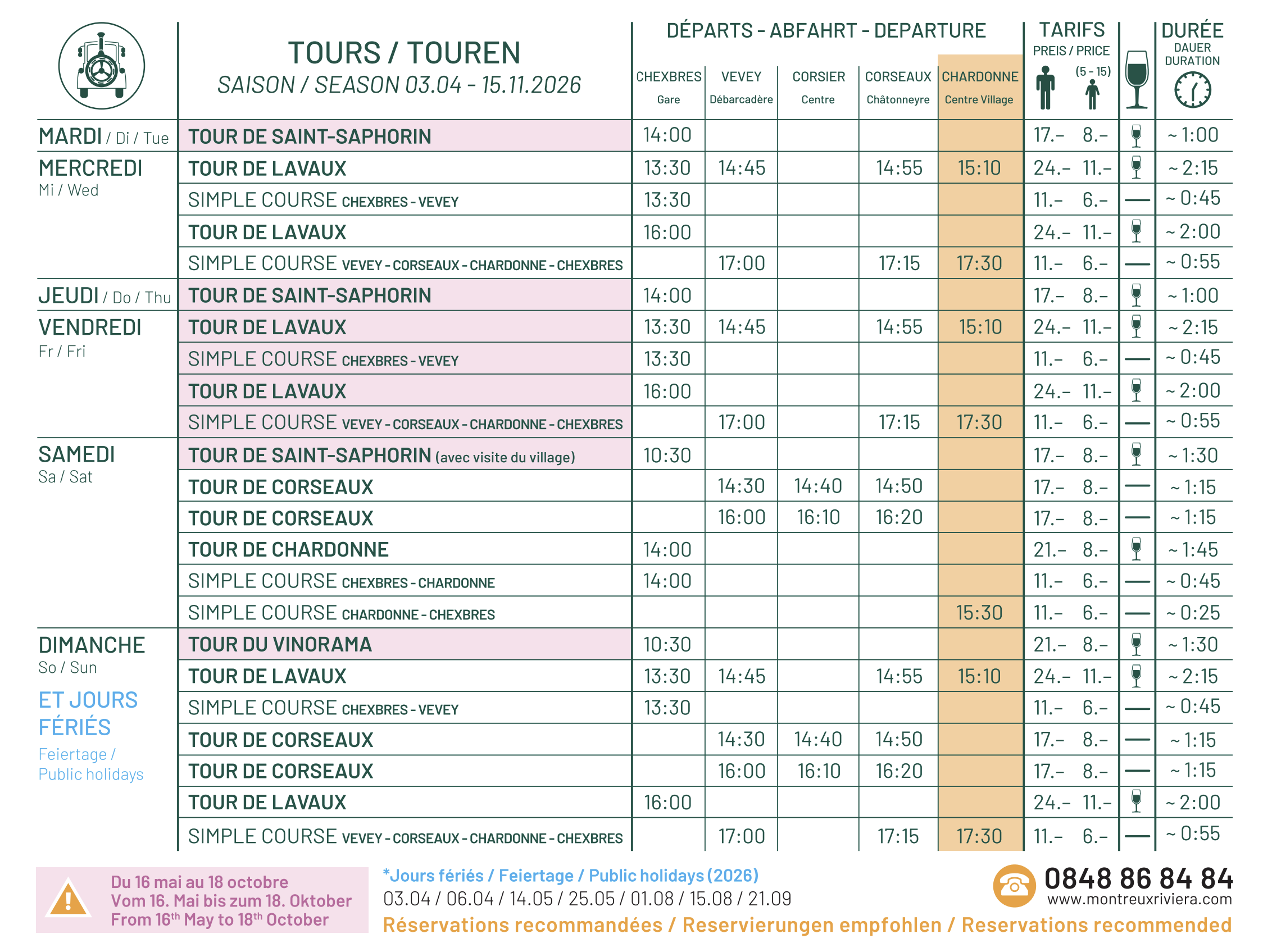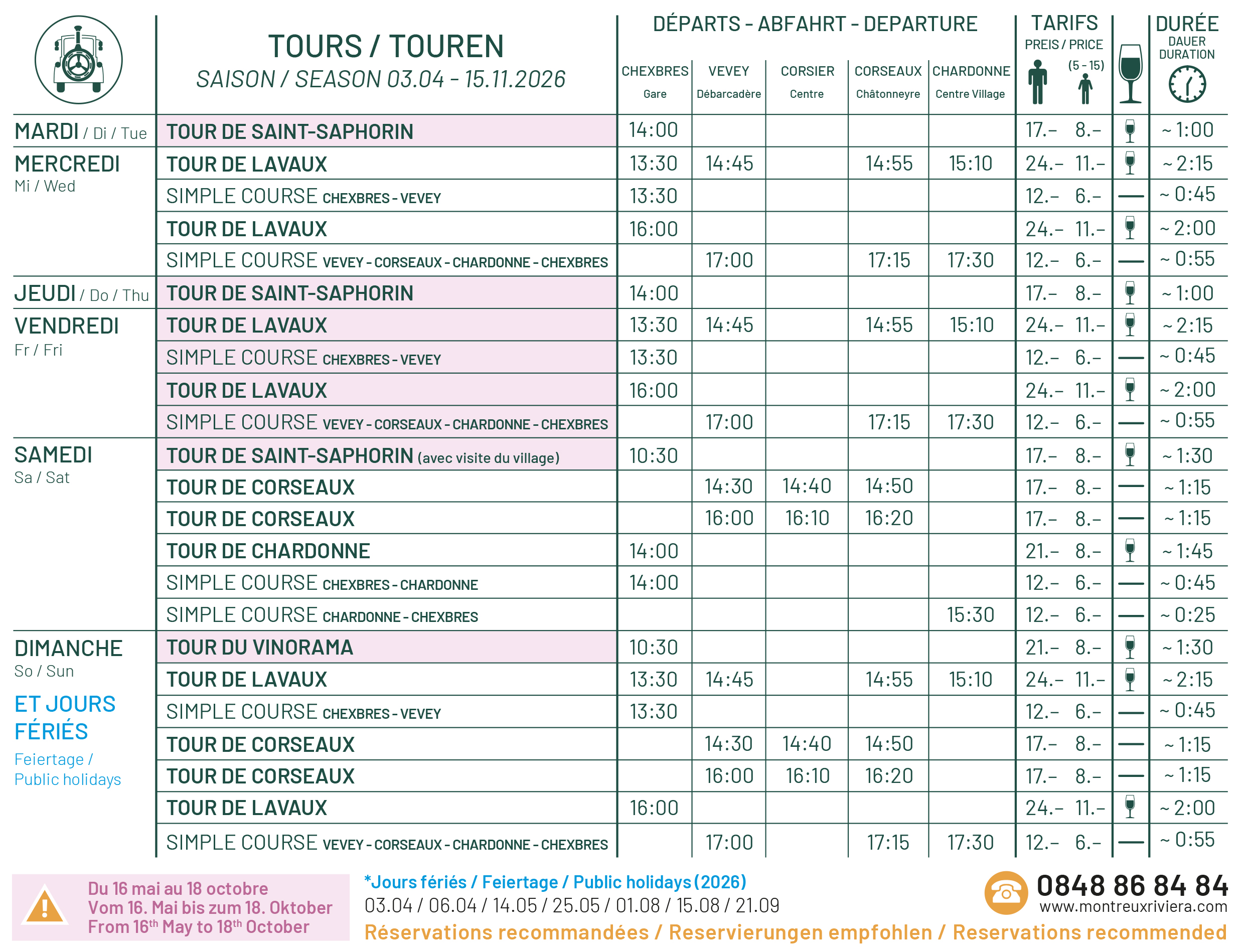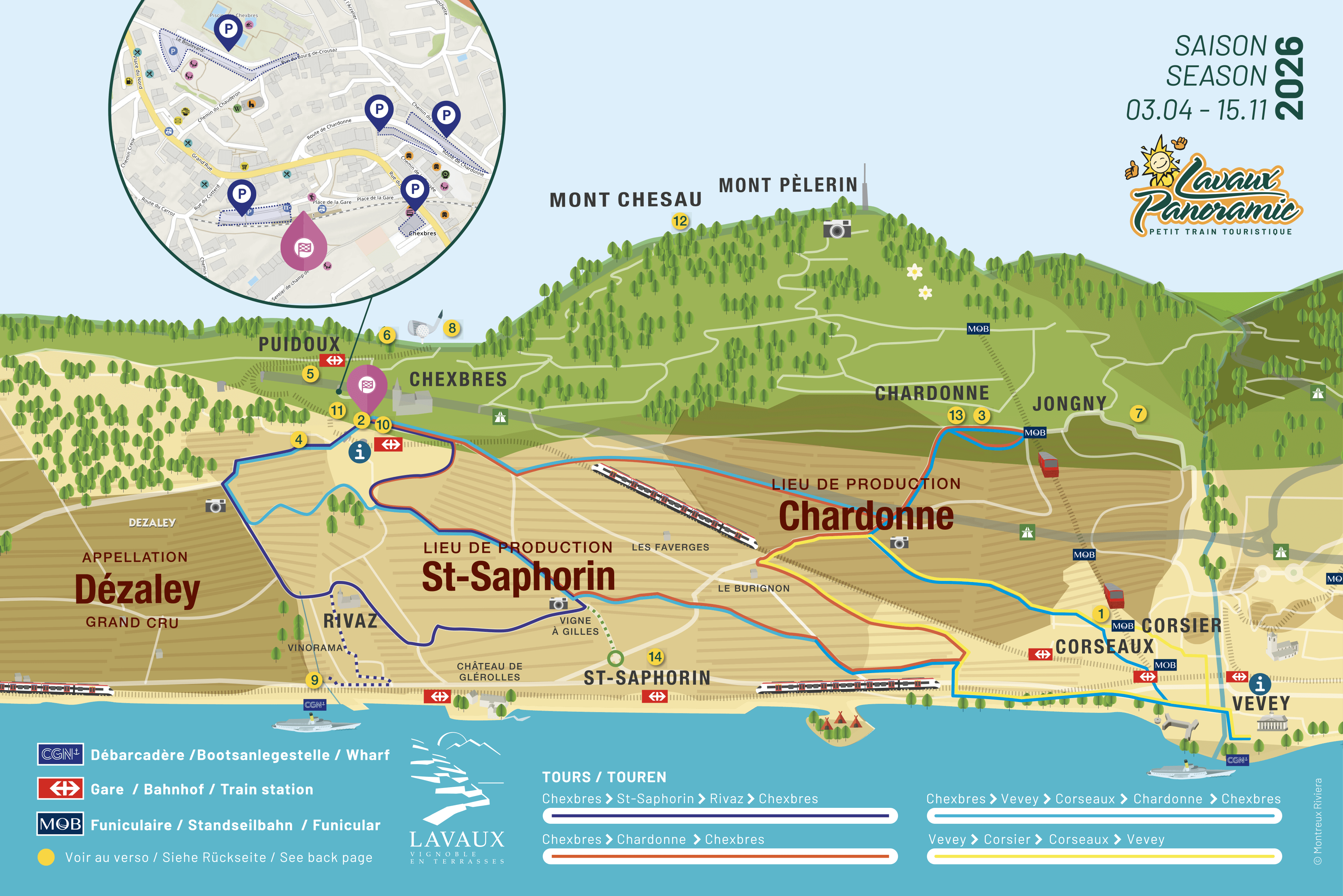 Ein besonderer Moment ausserhalb des Alltags zum Teilen mit Freunden, Kollegen oder der Familie. Erleben Sie eine einzigartige Entdeckungsreise voller Geselligkeit und Genuss im Weinbaugebiet von Lavaux. Für 15 bis 35 Personen – Dauer: 1h30. Reservierung beim Espace la Gare unter 021 946 32 62 oder 021 946 32 26.