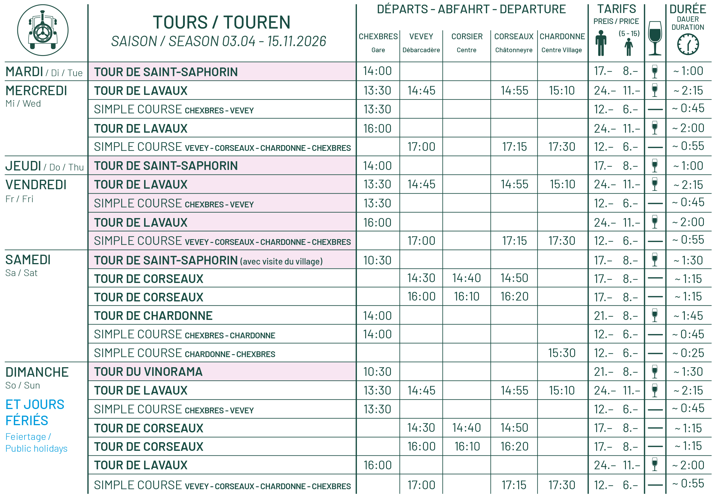 Für Ihre Ausflüge aller Art (Familien, Hochzeiten, Firmen, Gesellschaften, Zeitgenossen, Schulreisen, Vereine und andere) bis zu 90 oder sogar 120 Personen bieten wir Ihnen unsere Fahrten ab Chexbres oder anderen Orten nach Absprache an.